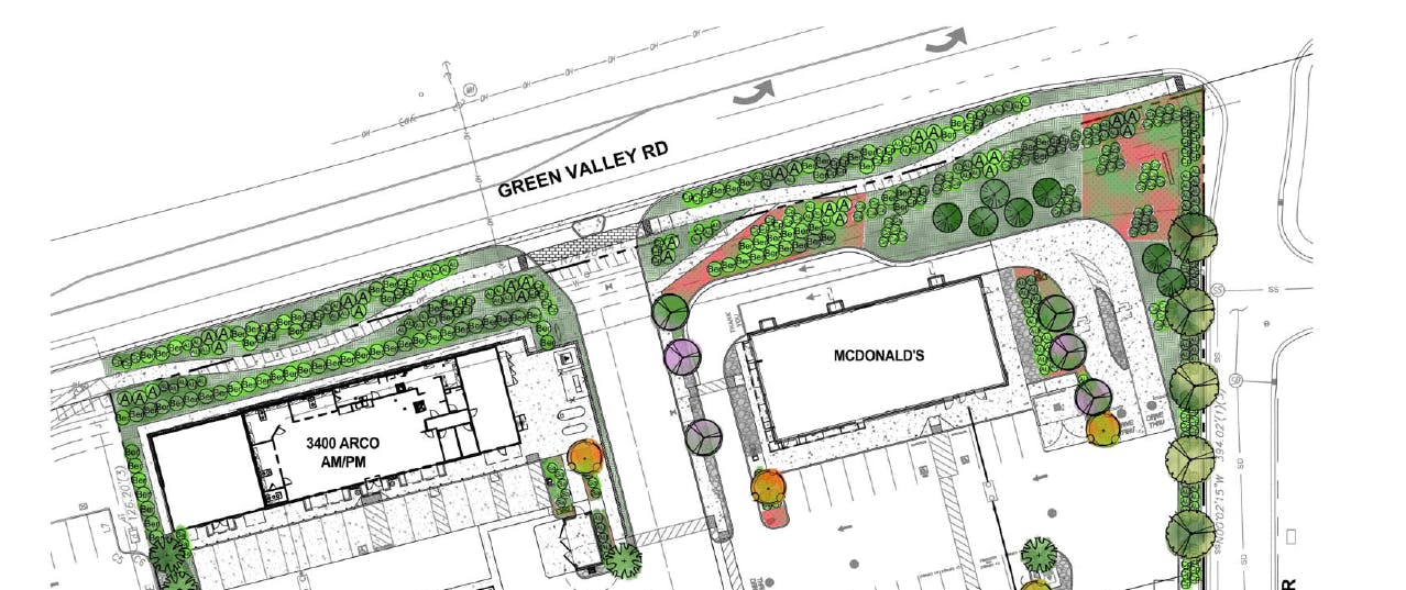 A Planned Development Permit (PD24-0003) and Conditional Use Permit (CUP25-0003) for a new commercial development, Green Valley Commercial Center, featuring a 1,459 square foot Quick Serve Restaurant (QSR) (no drive-through), a 3,549 square foot convenience store and fueling station with 4,366 square foot canopy and six (6) multi-product dispensers (MPDs) providing twelve (12) fueling positions (ARCO AM/PM), a 3,694 square foot restaurant with side-by-side drive-through (McDonald’s), and a 3,588 square foot, single-bay drive-through carwash (Quick Quack). The project includes associated on-site improvements for parking, lighting, landscaping, and signage (Uniform Sign Program), and off-site improvements for proposed traffic signals on Green Valley Road into the shopping center. The property, identified by Assessor’s Parcel Number 116-301-014, consists of 3.43 acres, and is located on the south side of Green Valley Road, 0.20 miles west of the intersection with Cameron Park Drive, in the Cameron Park area, and Supervisor District 2.